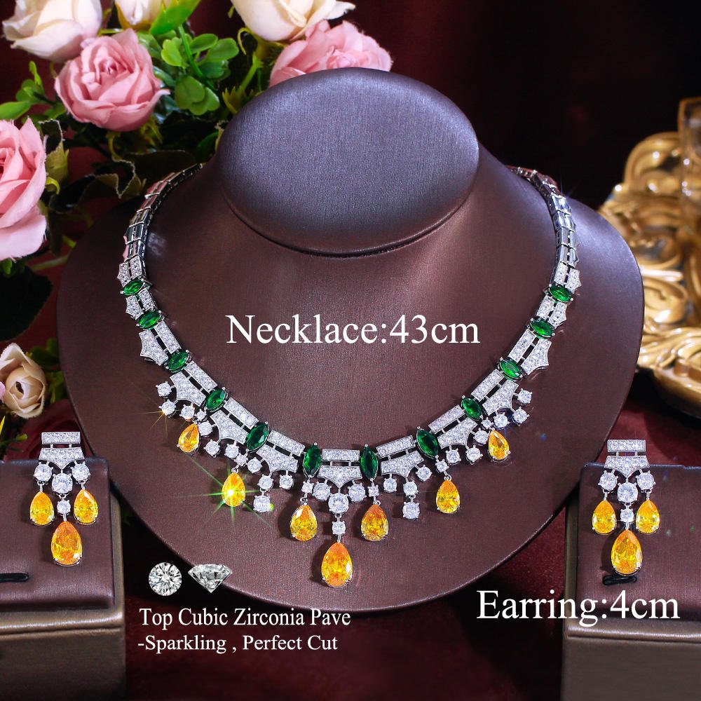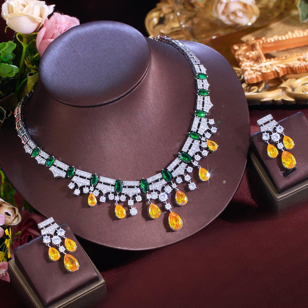 Glamorous Yellow Cubic Zirconia Dangle Water Drop Wedding Party Bridal Necklace Pageant Jewelry Sets for Women